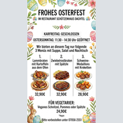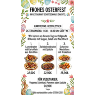In der Mittagszeit bieten wir nur unser Mittagsmenü an mit einer Alternative ( Schnitzel oder Gyros im Wechsel). Abends gilt die Speisekarte. Küche von 11:15-13:15 Uhr